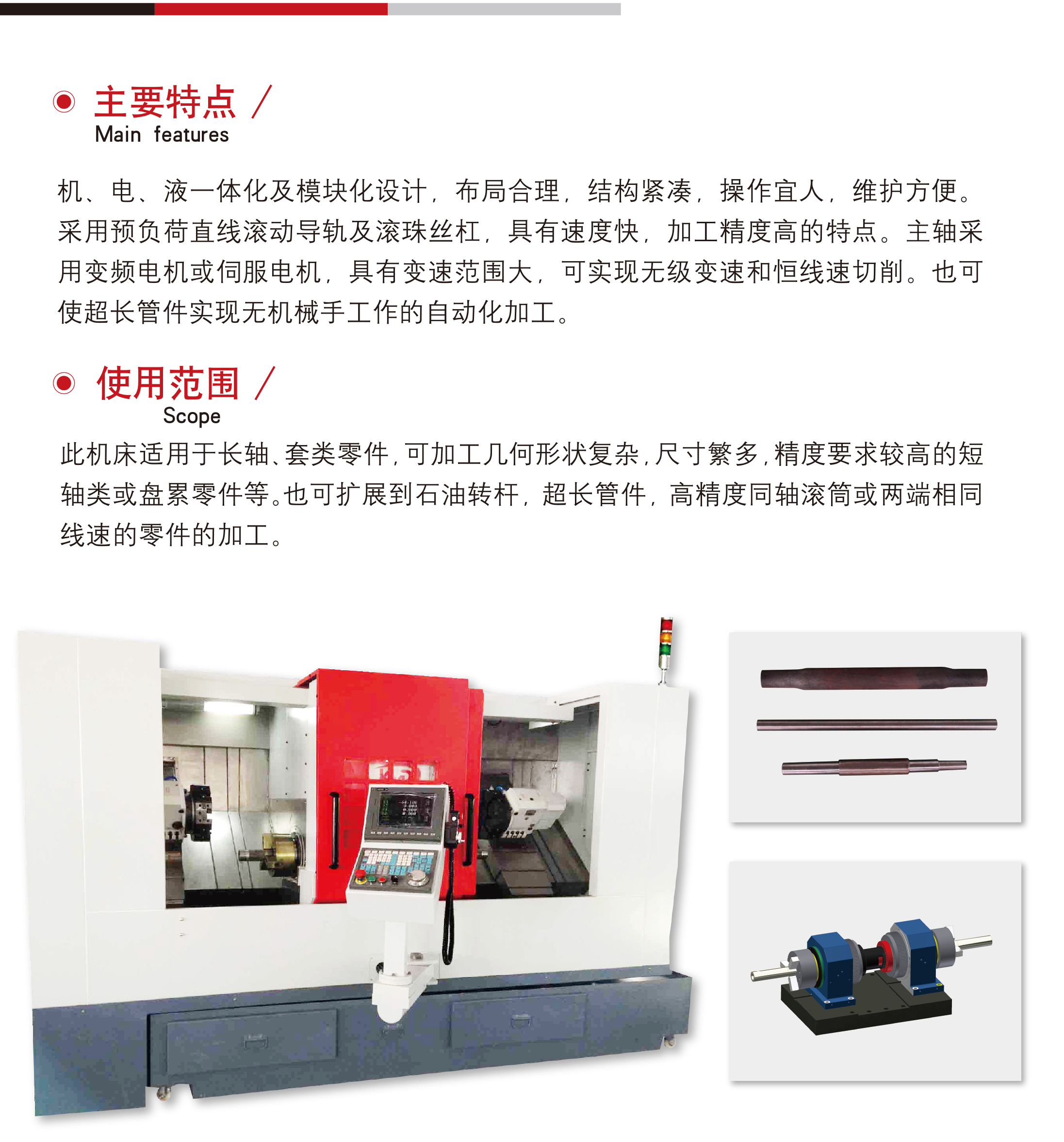 簡(jiǎn)要描述: 本(běn)産品整合(hé)回轉主軸(zhóu)、液、氣旋轉(zhuǎn)夾緊缸與(yu)精密筒夾(jiá)組合于一(yi)體,是專爲(wei)各式長形(xíng)軸、套類零(líng)件進行雙(shuāng)端同時加(jiā)工♊所設✔️計(ji)的精密機(ji)床。工件可(ke)以一次裝(zhuāng)夾後同時(shí)車削,省去(qu)工件卸 料(liao)再上料的(de)時間,并且(qiě)有效地保(bǎo)證工件的(de)同心度。