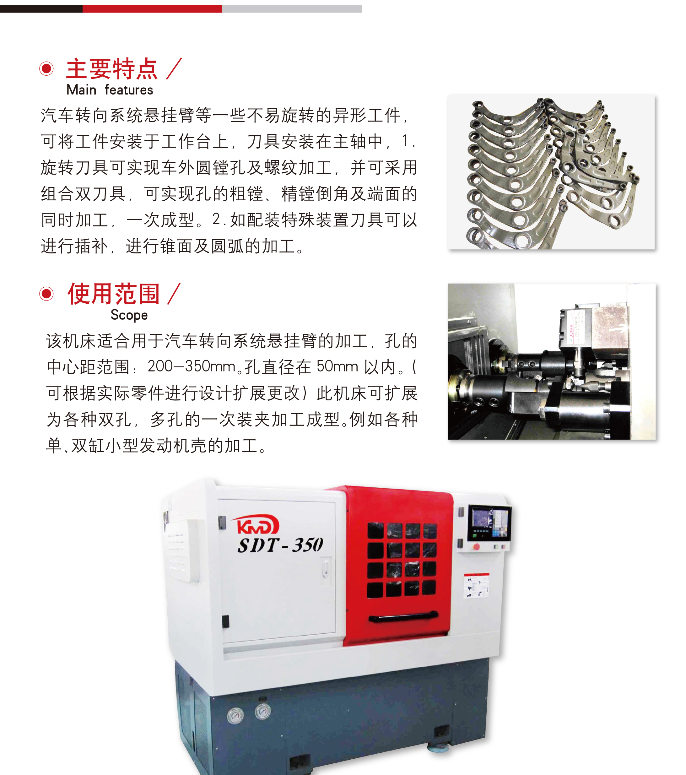 汽車轉(zhuan)向系統懸(xuan)挂臂等一(yī)些不易旋(xuan)轉的異形(xing)工件,可将(jiang)工件安裝(zhuāng)于工作台(tai)上,刀具安(an)裝在主軸(zhou)中,1 旋轉刀(dao)具可實現(xian)車📞外圓镗(tang)孔及螺紋(wen)加工,并可(ke)采用組合(he)雙刀具,可(ke)實現孔的(de)粗镗、精镗(táng)倒角及端(duan)面的同時(shí)加工,一次(ci)成型。