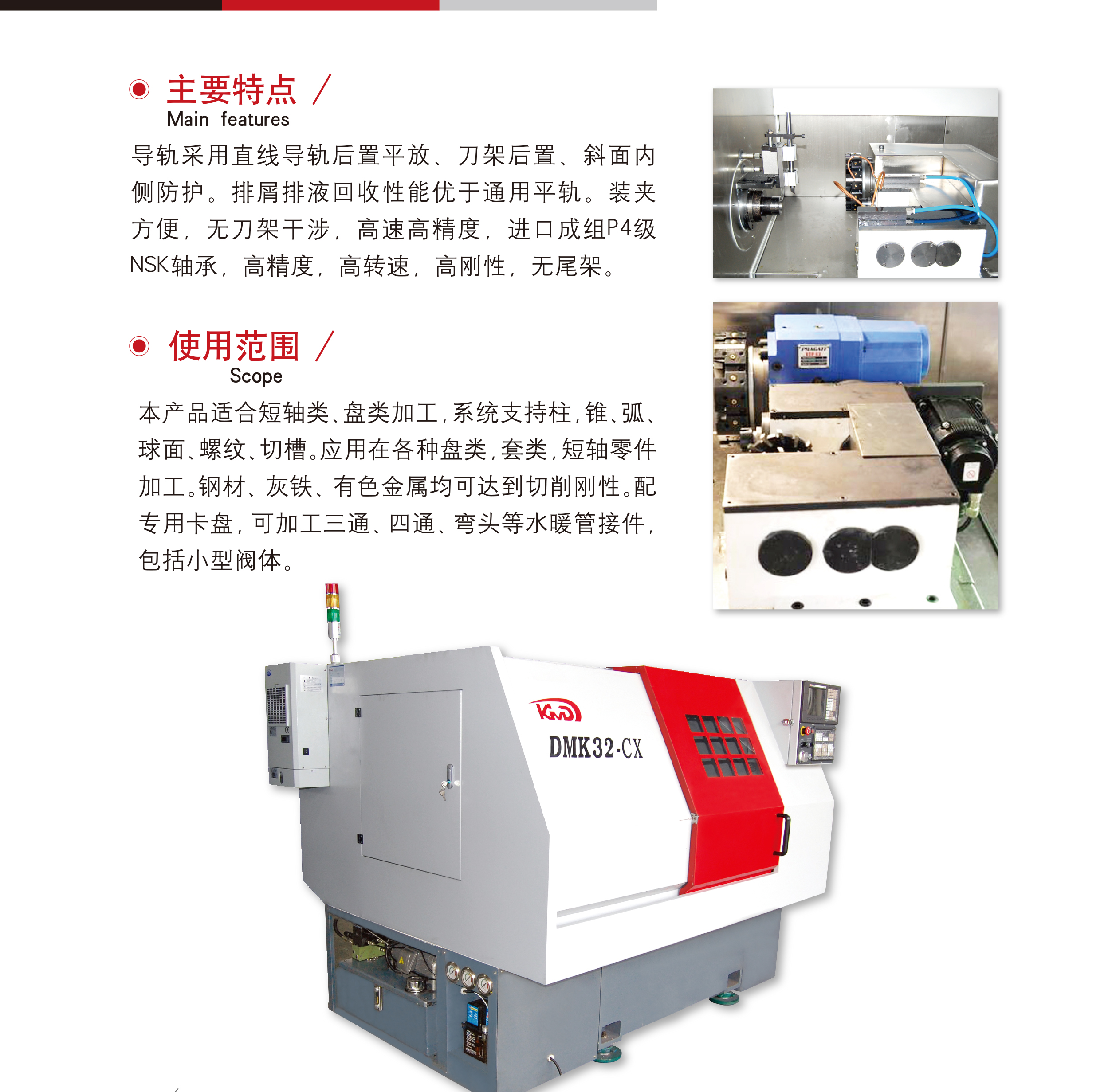 簡要(yao)描述: 導(dǎo)軌采用(yòng)直線導(dǎo)軌後置(zhì)平放、刀(dāo)架後置(zhì)、斜面内(nèi)側防護(hù)。排屑排(pai)液回收(shou)性能優(yōu)于通用(yòng)平軌。裝(zhuang)夾方便(bian),無刀🔞架(jià)幹涉,高(gao)速高精(jing)度,進口(kou)成組P4級(ji)NSK軸承,高(gāo)精度,高(gāo)轉速,高(gāo)剛性,無(wu)尾架。